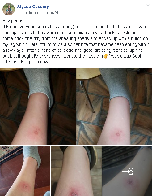 En su mensaje, la joven advirtió a todos que sean conscientes de las arañas que pueden esconderse en las mochilas de los turistas o en la ropa. Señaló que en septiembre notó un bulto en su pierna después de pasar un día trabajando al aire libre en una granja y descubrió que se trataba de la picadura de una araña "que empezó a comer la carne a los pocos días".