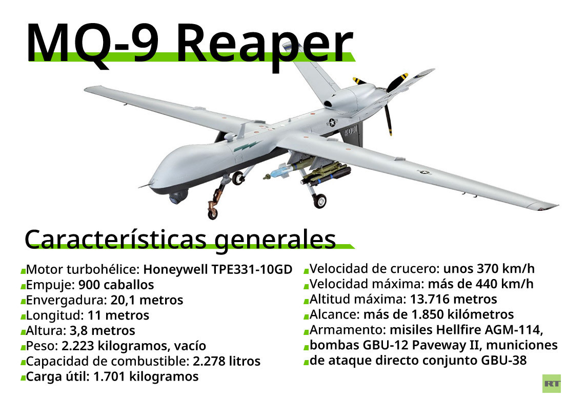 De acuerdo con varios medios de comunicación, se trata de un avión no tripulado estadounidense MQ-9 Reaper que disparó misiles contra el convoy de Soleimani mientras este se estaba desplazando cerca del aeropuerto de Bagdad. Desde el Pentágono por el momento no han confirmado el tipo de arma que se utilizó en el ataque.