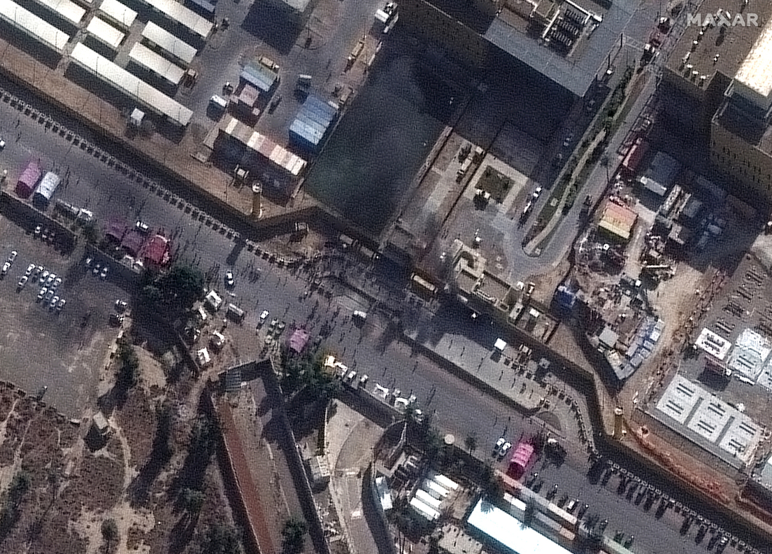 El satélite de observación de la Tierra WorldView-3 de Maxar Technologies captó el pasado 1 de enero imágenes de la Embajada estadounidense en Bagdad un día después de que fuera asaltada por una multitud. En la foto satelital se observa una columna de humo negro elevándose desde una sección de la sede diplomática, así como a un grupo de personas congregadas delante del edificio.