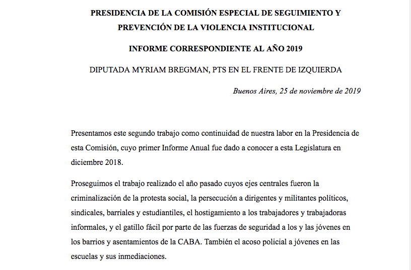 A su vez, el análisis, presentado por la titular de la comisión especial, la legisladora Myriam Bregman (Partido de los Trabajadores Socialistas - Frente de Izquierda), alerta sobre "el acoso policial a jóvenes en las escuelas y sus inmediaciones".