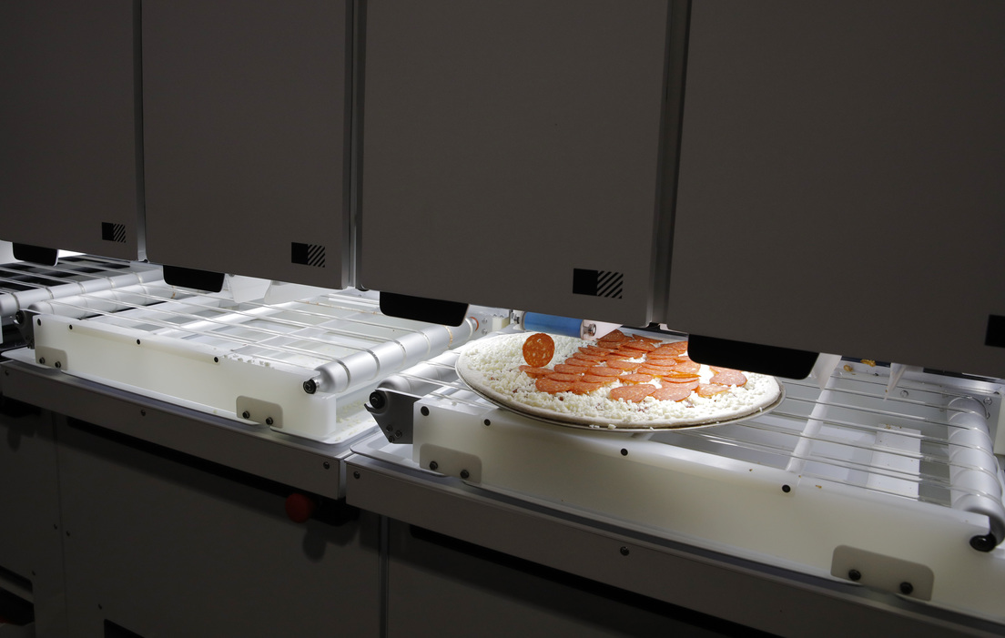 Este innovador sistema automatizado de preparación de alimentos utiliza inteligencia artificial y consta de tres paneles modulares compactos que se ensamblan para formar una cinta transportadora, la cual puede identificar una masa de pizza prefabricada y añadirle varios ingredientes.