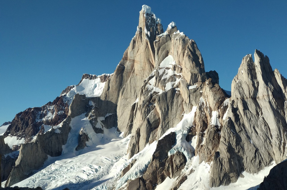 En enero del año pasado, Alexey subió a la cima del cerro Fitz Roy (3.405 metros sobre el nivel del mar) con un cliente. Después de escalar, y aprovechando el buen clima que había ese día, decidieron dar un paseo por el paso cercano, desde el cual se ve el grupo de picos del imponente cerro Torre (3.133 msnm) con mayor claridad.