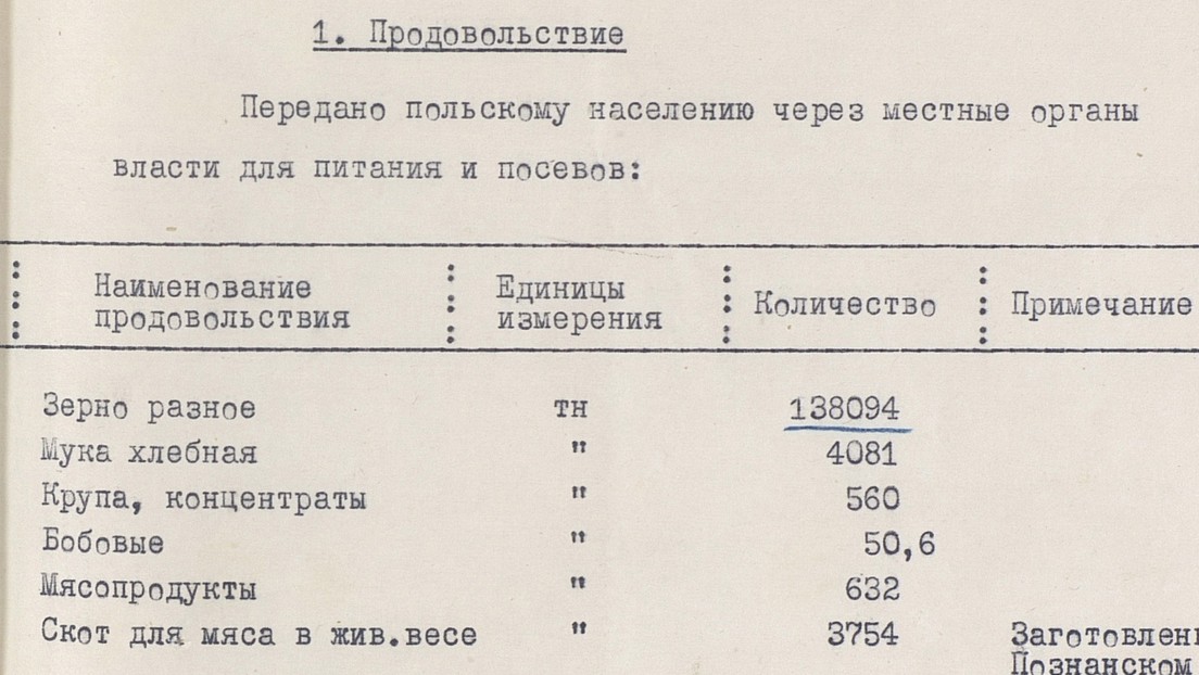 Uno de los documentos desclasificados informa cómo el Ejército Rojo, entre 1944 y 1945, proporcionó a los polacos 316.000 toneladas de papas y vegetales, así como más de 138.000 toneladas de diferentes granos.