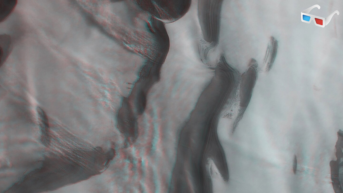 La Agencia Espacial Europea ha publicado esta semana una imagen tridimensional de la región polar de Marte durante una fuerte tormenta. En medio de las brillantes franjas blancas y rojizas se aprecian indicios de un intenso desplazamiento de hielo atmosférico y superficial y también polvo.