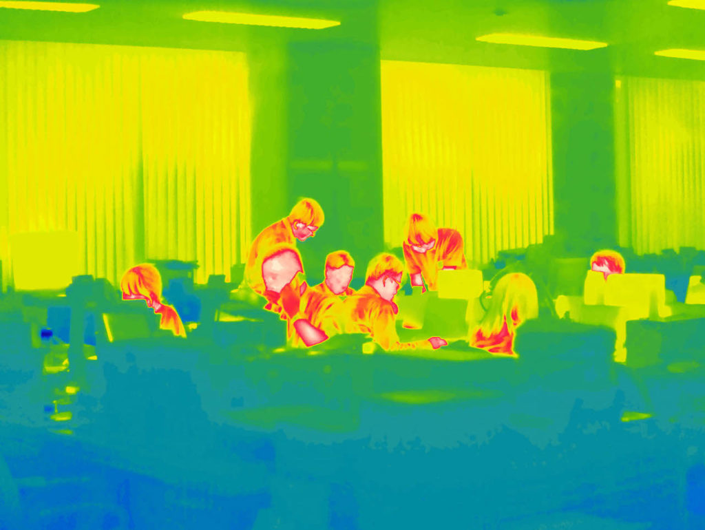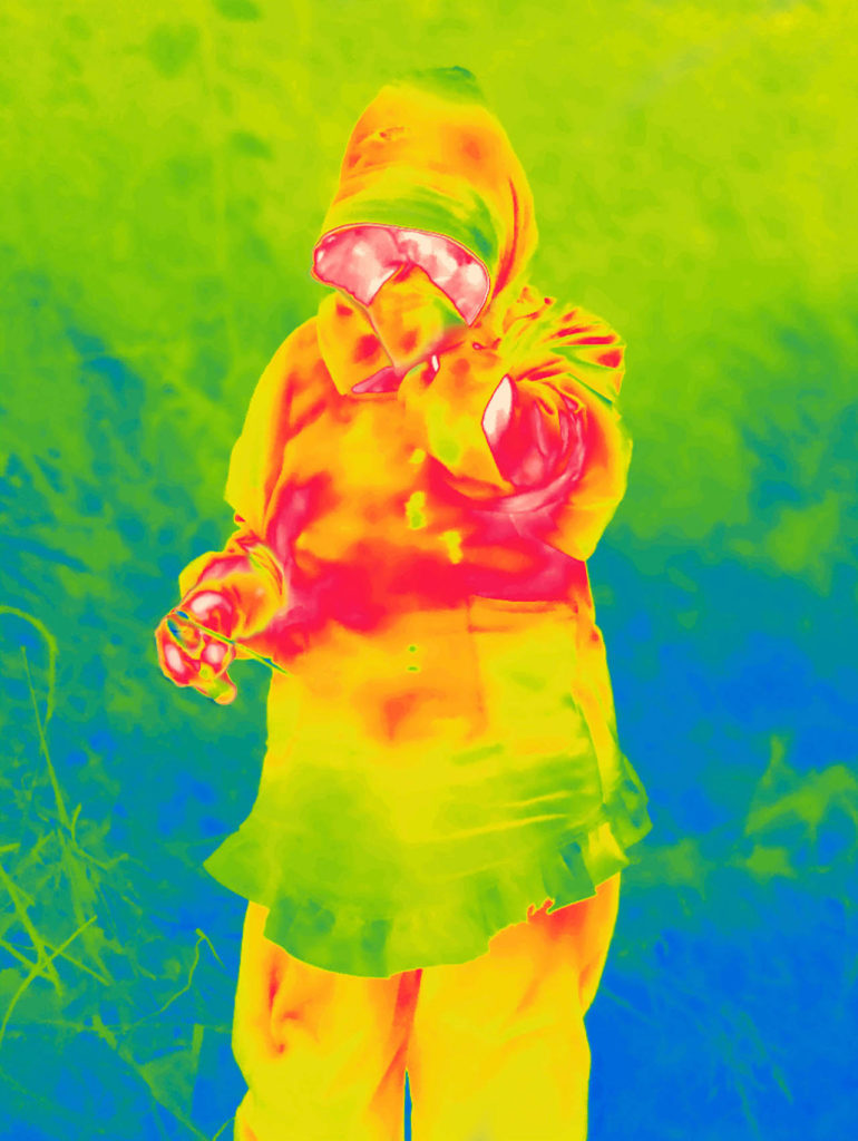 En general, las imágenes térmicas se utilizan para detectar ciertas enfermedades y en particular cánceres (que no es el caso). Aquí hay un elemento de anonimato, que este estilo de toma aporta al trabajo.