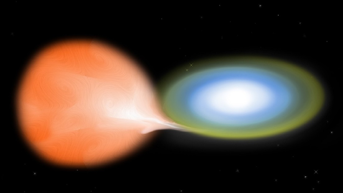 Se trata de un sistema estelar binario, en el que el primer componente es una enana blanca y el otro es una compañera enana y marrón —aproximadamente 10 veces más grande—, de la cual la primera "absorbe la esencia como un vampiro", explica la NASA.