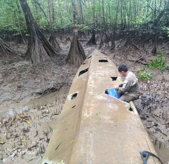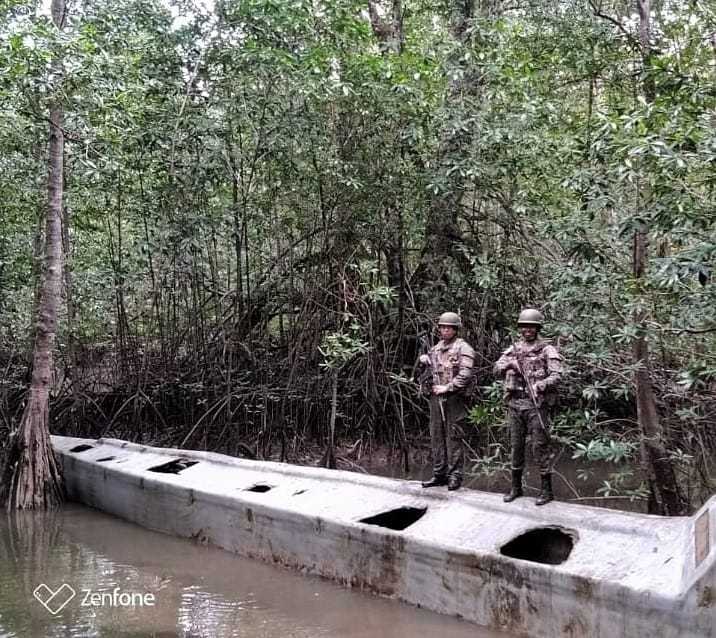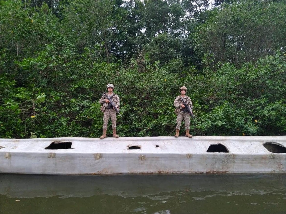 El Batallón de Infantería de Marina No.22 logró localizar este artefacto naval, de 17 metros de eslora y dos metros de ancho, en un estero del río Ijuá, en medio de una zona de mangles, donde había sido escondido por una organización criminal.