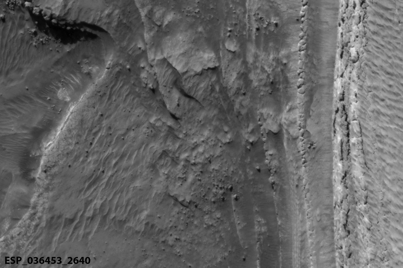 "El borde escarpado de la capa polar norte se está desmoronando. Esta animación muestra dónde una sección de la ladera de la derecha se ha derrumbado desde hace tres años marcianos y ha depositado un campo de bloques de hielo", explicó el geólogo planetario Alfred McEwen.