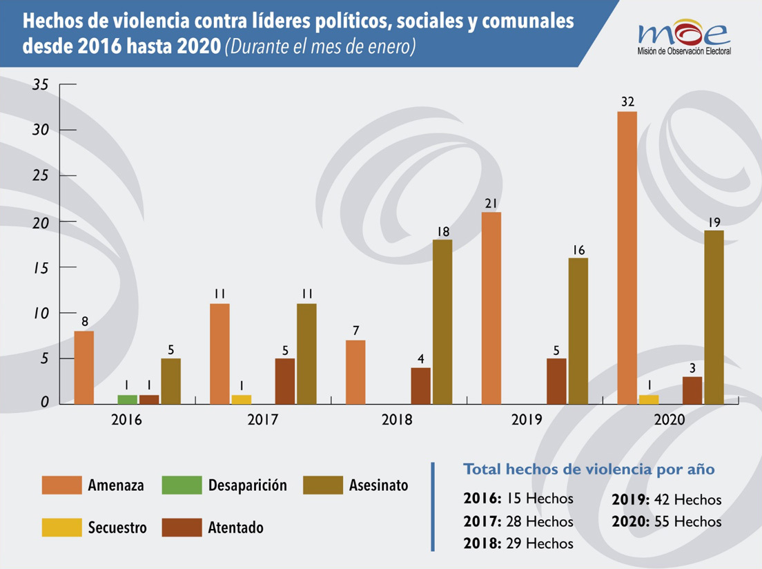 "El pasado mes de enero ha sido el más letal en cuanto a violencia contra líderes sociales, comparado con el mismo mes, desde 2016", ha afirmado la Misión de Observación Electoral (MOE), una organización no gubernamental (ONG) colombiana integrada por agrupaciones de la sociedad civil.