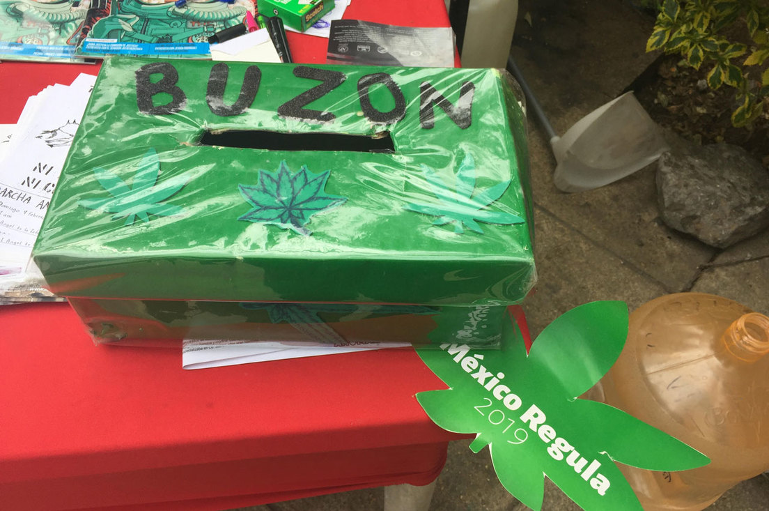 A su alrededor, una decena de hombres se reparte tareas en el campamento. En la mesa de recolección de firmas hay una caja forrada de papel verde. Es un buzón para sugerencias o, si se quiere, donaciones. Por doquier hay hojas de marihuana de cartón con el lema "México regula 2019". Los activistas dicen que las de 2020 están por llegar.