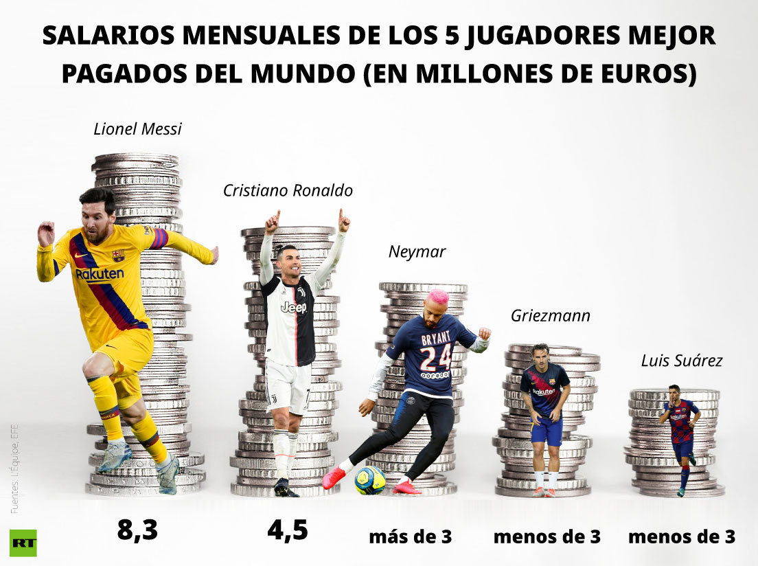 El delantero argentino repite como futbolista mejor pagado del mundo por delante del portugués Cristiano Ronaldo. Según la lista del diario francés, Messi gana más de 8,3 millones de euros en bruto al mes, frente a los 4,5 millones que gana el luso en la Juventus de Turín.