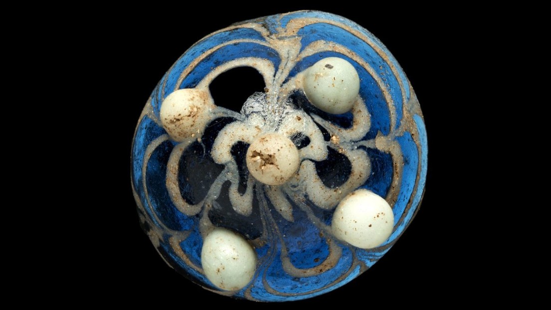 Se trata de una figura de vidrio azul brillante con exuberantes remolinos blancos y un anillo de cinco bolas blancas que se asemejan a una corona. Estas características sugieren a los expertos que se trata de una pieza maestra que ocupaba una posición privilegiada en el tablero de juego.