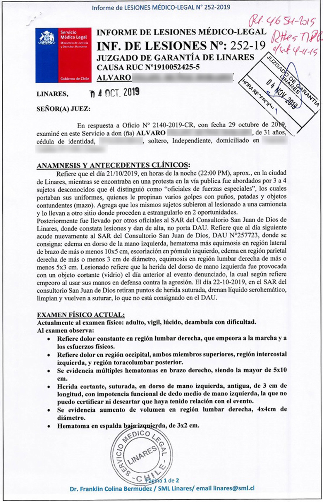 Aunque sea exagerado decir que en Chile se vive una dictadura, subraya que las fuerzas de seguridad actuaron como un grupo de tareas. De hecho, en el informe oficial sobre su detención solo aparece el segundo grupo de Carabineros. Sobre el primero, que habría propinado golpizas y otros ataques, no hay registros: "Nadie sabe quiénes fueron, no figuran en el parte de detención".