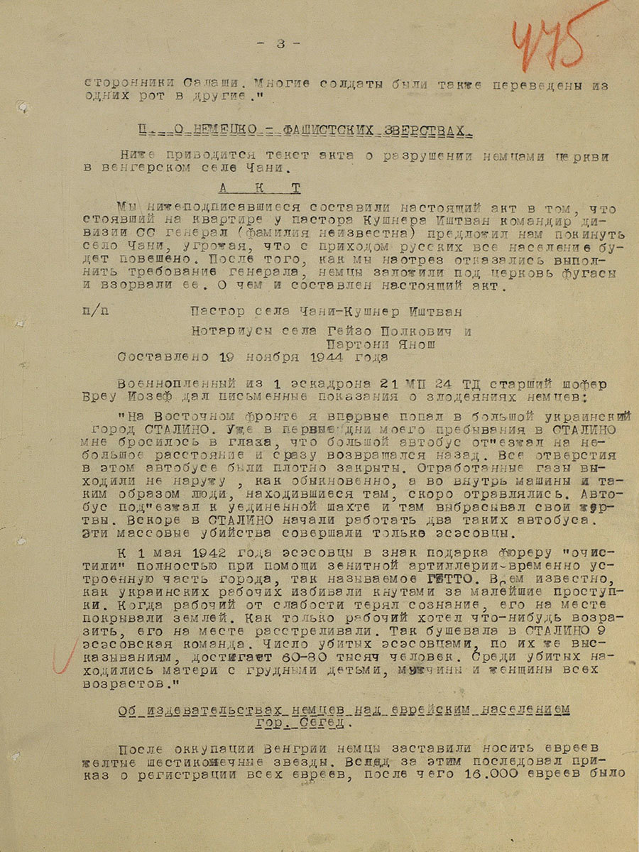 Los documentos también evidencian las atrocidades de las tropas de la Alemania nazi en la vecina Ucrania, al principio de la Segunda Guerra Mundial. Para el 1 de mayo de 1942, los nazis, en calidad de regalo para el führer, "limpiaron" totalmente con artillería antiaérea el gueto de la ciudad ucraniana de Stálino, cita el documento el interrogatorio de un prisionero de guerra que luchaba junto con los nazis en el Frente Oriental.