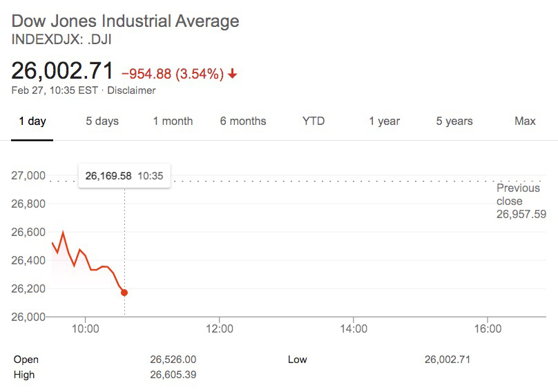 Este jueves, el índice Dow Jones ha caído 954 puntos en la Bolsa de Valores de Nueva York, en medio de las preocupaciones de los inversores relacionadas con la propagación del coronavirus en EE.UU.