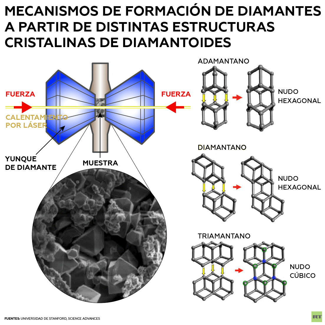 Los investigadores de Stanford buscaron un modo de fabricar diamantes en laboratorio. "Simplemente quisimos ver un sistema limpio, en el que una sola sustancia se transformara en diamante puro, sin un catalizador", explicó la geóloga Sulgiye Park, autora principal del estudio publicado la semana pasada en Science Advances.