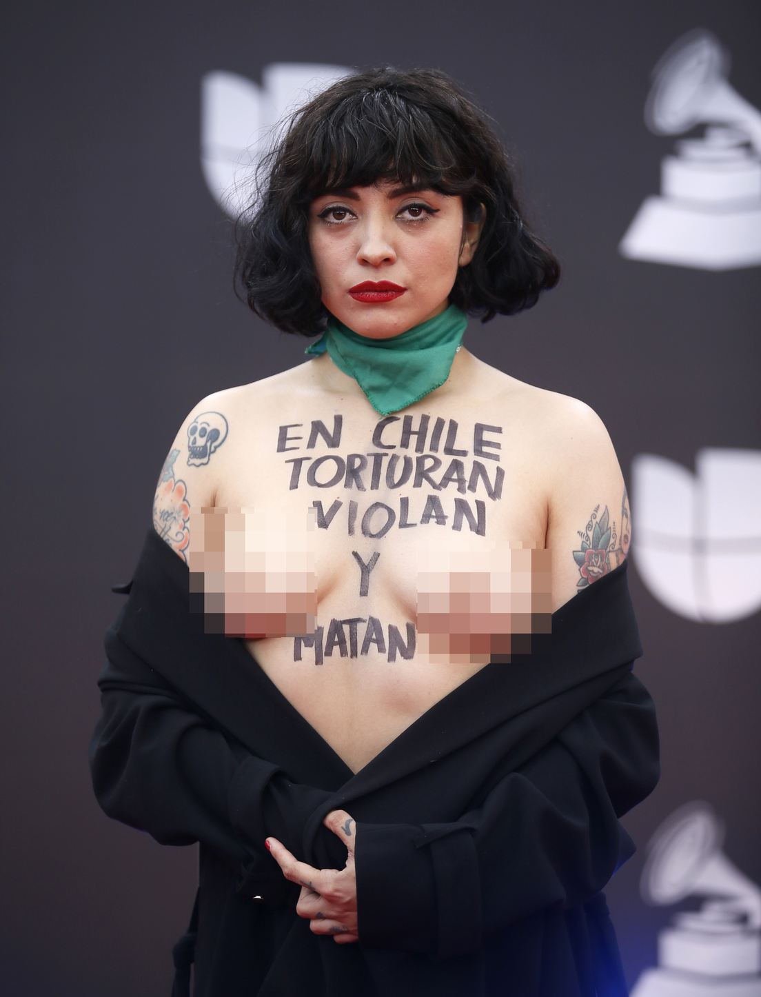 "Estado opresor", "muerte al paco asesino y violador", "apruebo la convención constitucional", "Chile despertó", fueron otros de los lemas que marcaron este Festival, en el que una de las presentaciones que despertaba más expectativa era la de Mon Laferte, la cantante que el año pasado posó en la alfombra roja de los Grammy Latinos con los pechos desnudos y el mensaje escrito en su cuerpo: "En Chile torturan, violan y matan".