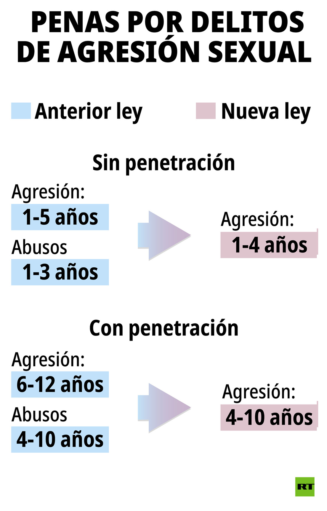 - Agresión con penetración: entre 4 y 10 años de cárcel (actualmente entre 6 y 12 si es agresión y de 4 a 10 si es abuso).