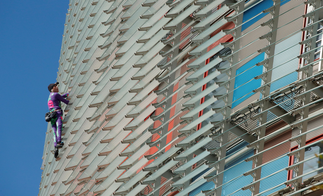 Alain Robert, conocido como el 'Spiderman francés', escaló este miércoles la Torre Glòries (también llamada Torre Agbar) de Barcelona (España) sin ningún tipo de protección.