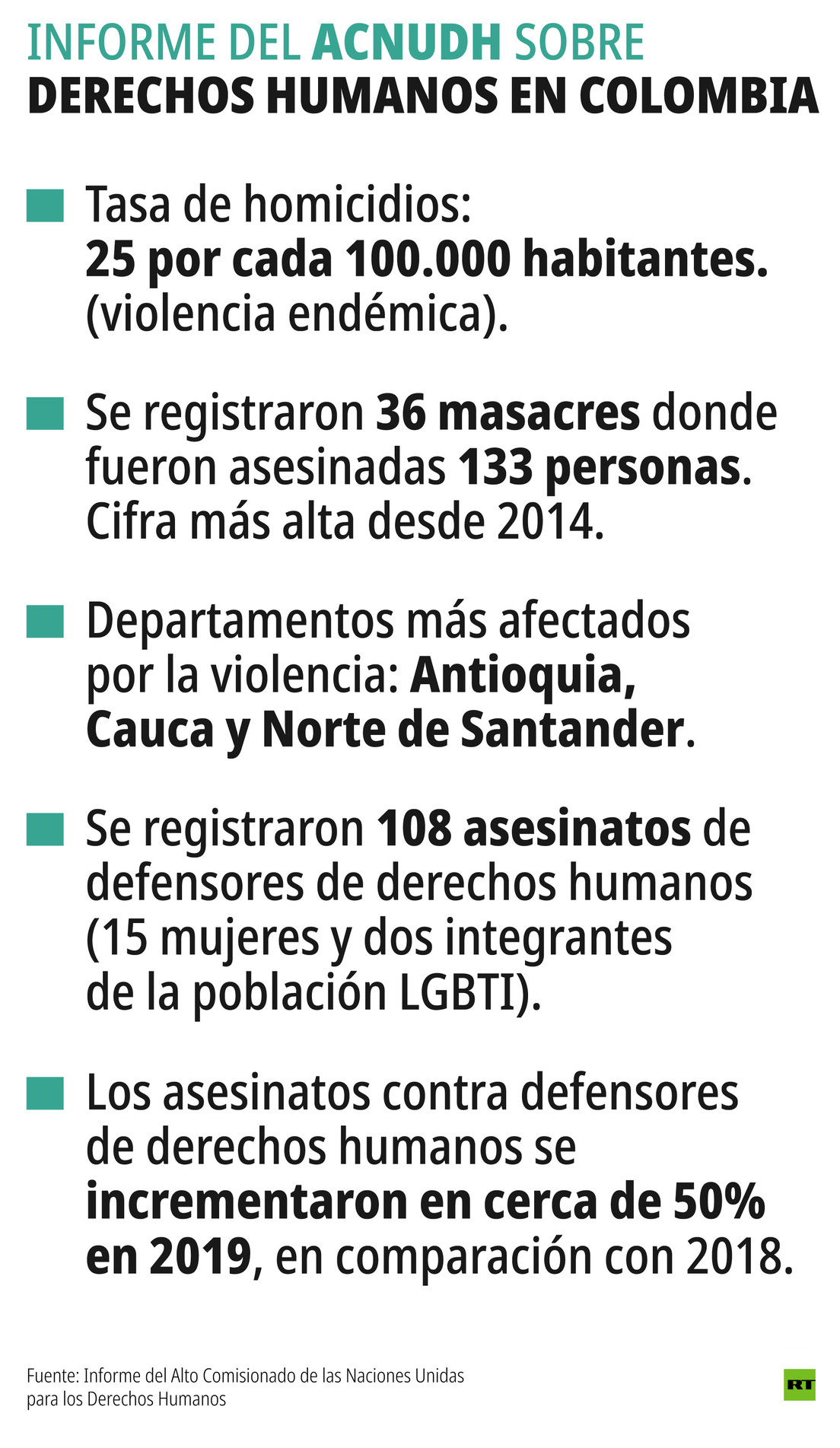 Los datos del informe del Alto Comisionado de ONU para los Derechos Humanos sobre Colombia en 2019 ponen de manifiesto el incremento de la violencia en el país suramericano, en comparación con los años anteriores.