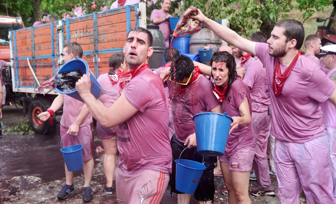 La Batalla del Vino se celebra en la localidad de Haro, en la Comunidad Autónoma de La Rioja, al norte de España. Se desarrolla anualmente durante la festividad de San Pedro, el 29 de junio, y consiste en arrojar vino tinto a otros participante hasta que su vestimenta blanca se tiñe de morado.