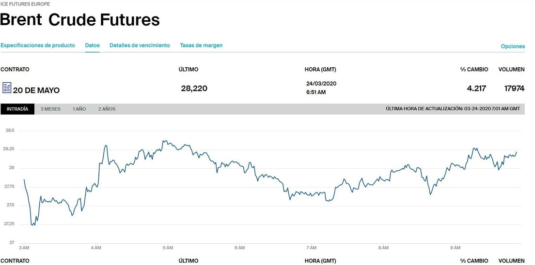Así, en la bolsa londinense ICE Futures, el precio de los futuros de Brent para mayo a las 5:14 (GMT) ha cotizado a 27,97 dólares por barril, 0,94 centavos, más que representa un 3,48% de aumento en comparación con el precio de cierre de la sesión anterior.