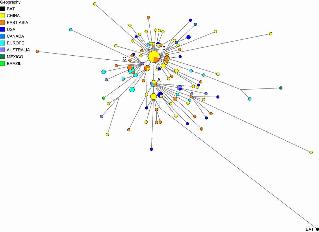 Un grupo de investigadores del Reino Unido y Alemania recurrió a técnicas de redes genéticas para reconstruir los primeros caminos evolutivos de covid-19 en humanos, así como para mapear parte de la propagación original del coronavirus desde Wuhan a Europa y América del Norte.