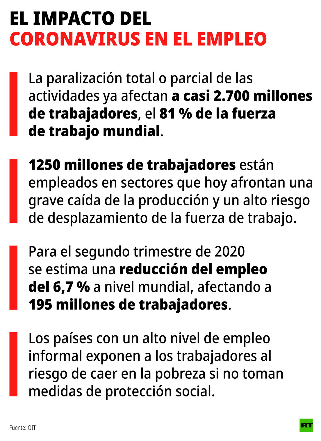 La pandemia de coronavirus está devastando la economía mundial como no había ocurrido desde la Segunda Guerra Mundial, y ha causado una reducción "sin precedentes" de la actividad laboral, según estimaciones de la Organización Internacional del Trabajo (OIT). El organismo especializado, dependiente de las Naciones Unidas (ONU), señaló en un reciente informe que las medidas de paralización total o parcial de los procesos productivos ya afectan a casi 2.700 millones de trabajadores, es decir, a 81 % de la fuerza de trabajo mundial.