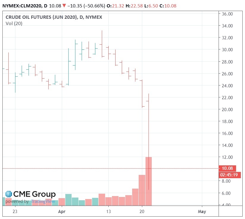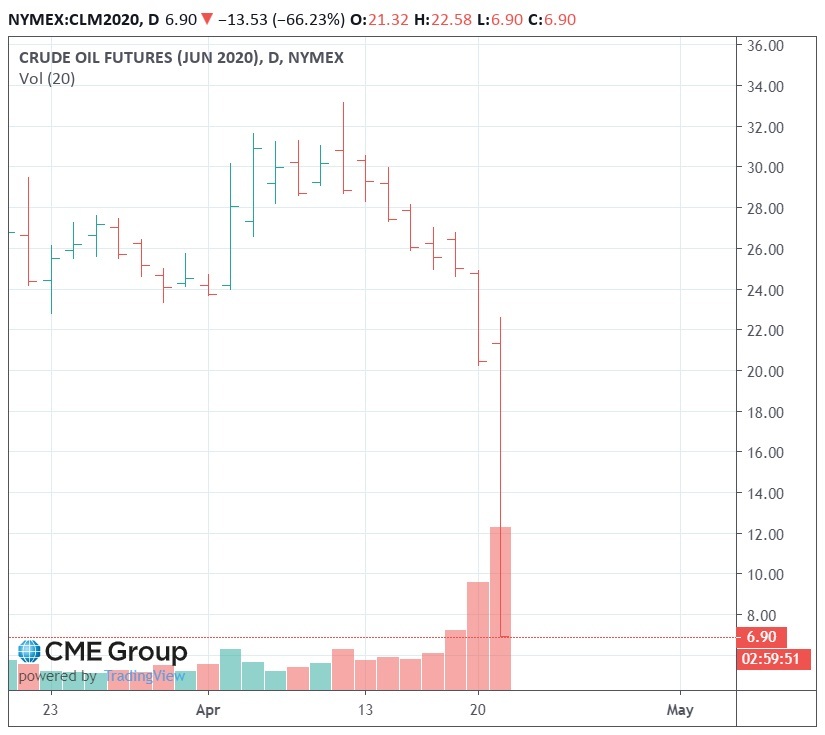 Así, debido a la crisis de demanda global causada por la pandemia de covid-19, el precio de los futuros de WTI para junio ha caído hasta 6,90 dólares por barril a las 17:59 (GMT) y luego registró su mínimo de esta jornada de 6,50 dólares.