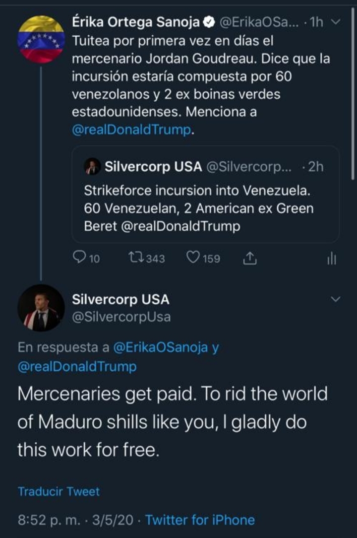 Después de ese tuit, Silvercorp le contestó: "A los mercenarios se les paga. Para librar al mundo de cómplices de Maduro como tú, con mucho gusto hago este trabajo gratis". Esta interacción fue borrada.
