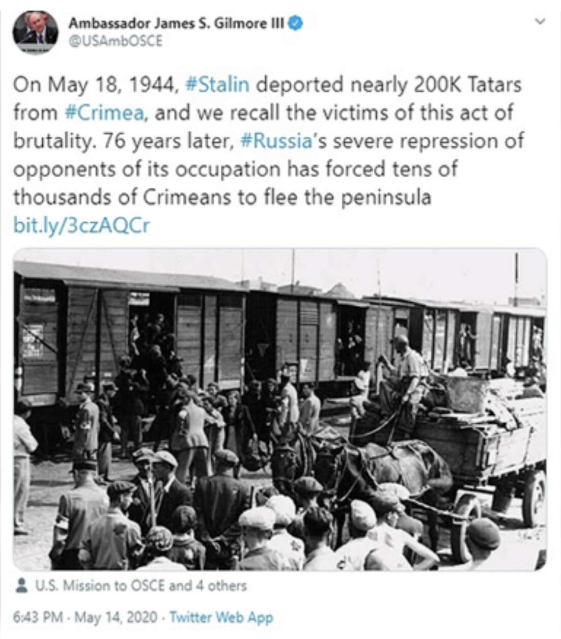 James S. Gilmore III, embajador de EE.UU. ante la Organización para la Seguridad y la Cooperación en Europa (OSCE), utilizó una foto de un gueto judío en Polonia como parte de su publicación sobre la deportación de los tártaros de Crimea en 1944.