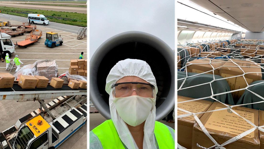 Entre los paquetes que pudo observar del viaje humanitario a Shanghái, había barbijos, mascarillas plásticas y guantes de latex descartables. La gran mayoría era solicitada por el Ministerio de Salud de la Provincia de Buenos Aires. Así, esa mercadería a bordo iba atada con redes sobre los asientos: "En lugar de pasajeros, había cajas", cuenta Silvina. Y describe: "El avión se convirtió en un carguero. Ya no hacíamos la guardia para que los viajantes estén bien, nos turnamos para observar y cuidar la carga". Esta vez, tampoco era necesario usar el típico uniforme.