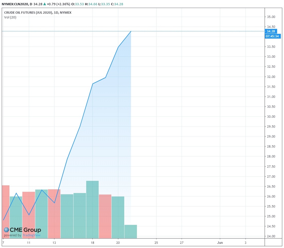Así, el precio de los futuros para julio del crudo europeo de referencia internacional Brent, que se ha situado en 35,80 dólares a la hora de la apertura de la sesión, se ha elevado más del 2,3% en lo que va de esta jornada, alcanzando su punto máximo en 36,87 dólares.