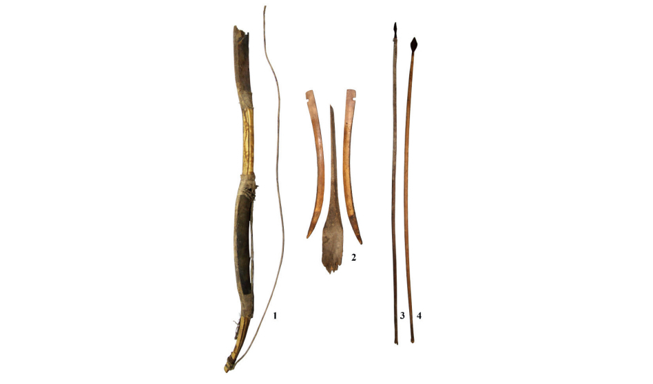 En cuanto al armamento, los arqueólogos hallaron un cuchillo de hierro y un arco compuesto, dotado de un carcaj de cuero con flechas.