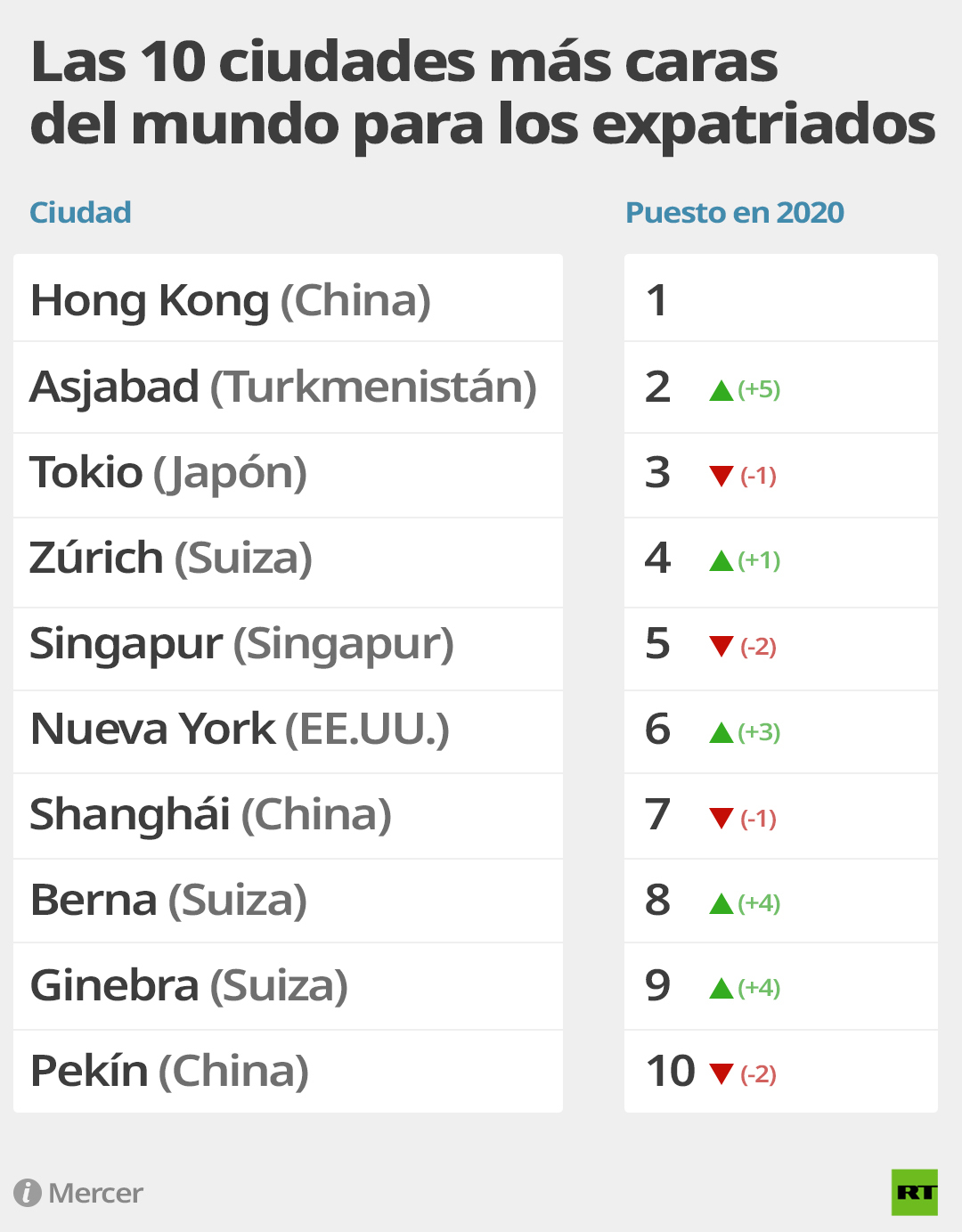 Por tercer año consecutivo, la lista es encabezada por Hong Kong. A pesar de las protestas, la urbe ha mantenido su ránking debido a las fluctuaciones monetarias frente al dólar estadounidense, así como al aumento del costo de vida en la ciudad, según Mercer.