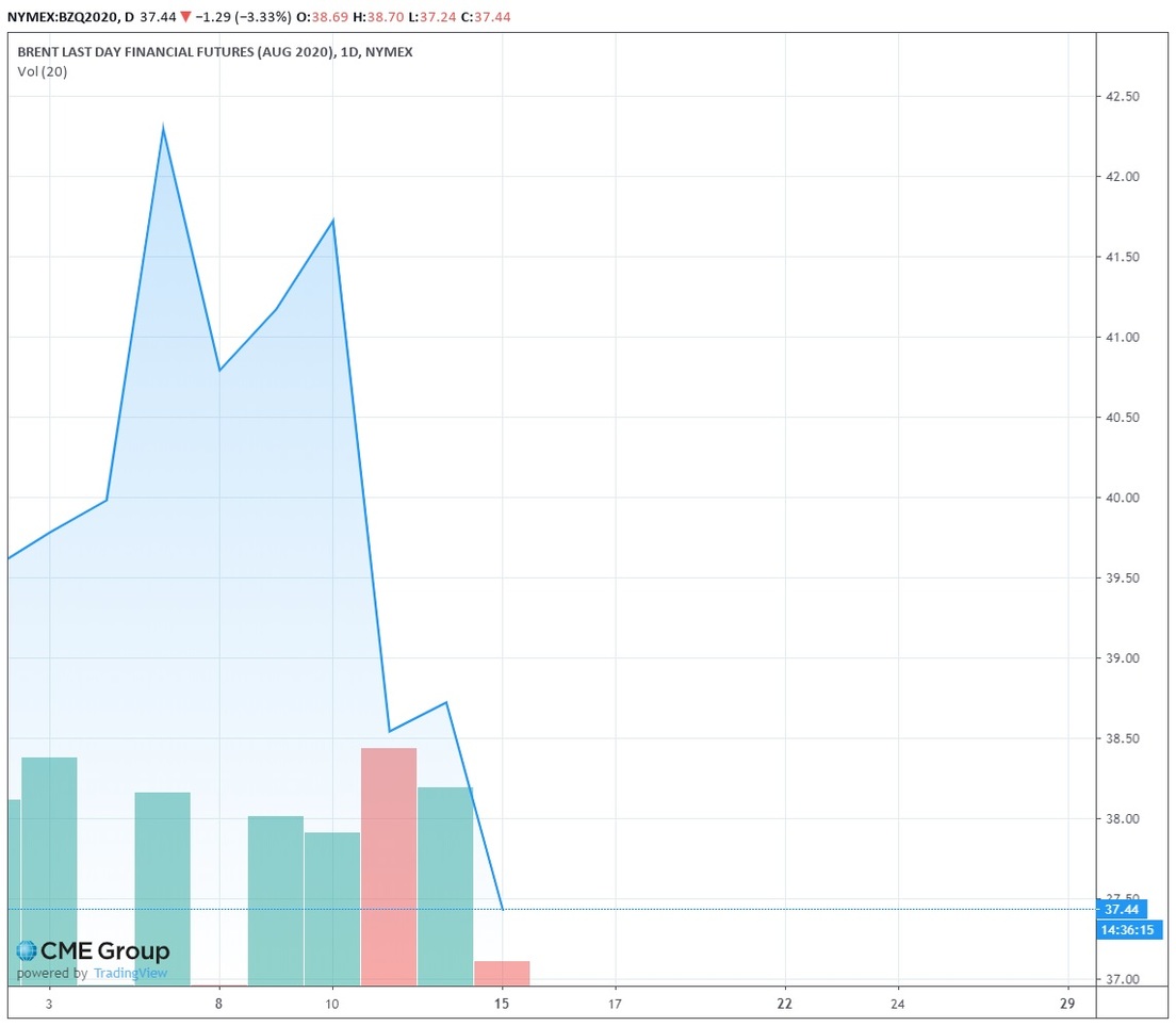 De acuerdo con los datos de la Bolsa Mercantil de Chicago (CME, por sus siglas en inglés), el precio de los futuros para agosto del crudo europeo de referencia internacional Brent a la hora de la apertura de la sesión se ha situado en 38,69 dólares y luego ha bajado hasta los 37,24 dólares, lo que representa una caída de casi el 4%.