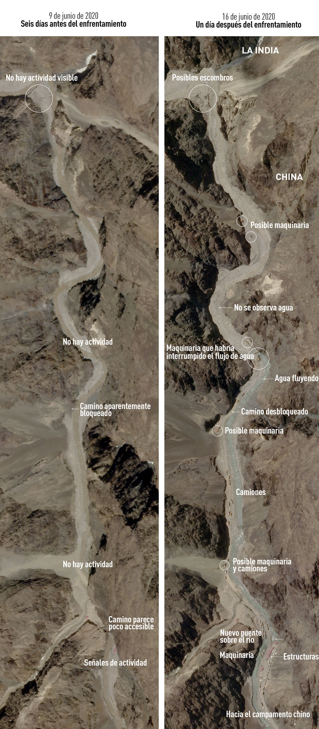 Las imágenes satelitales de la disputada zona en el valle de Galwan, en el Himalaya, muestran una actividad creciente en la parte china un día después de su violento enfrentamiento con tropas indias.