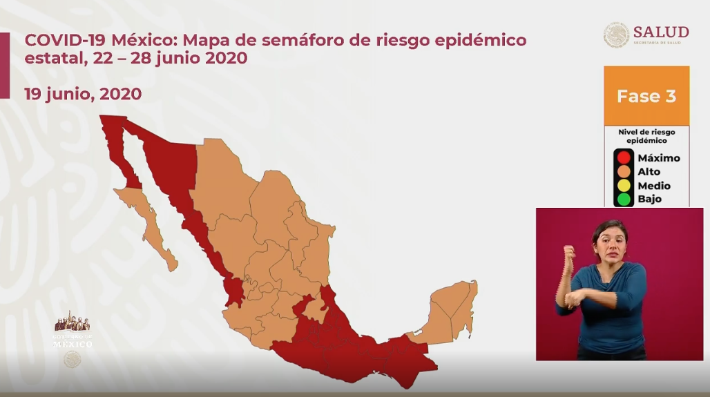 Este día, el Gobierno federal informó que 15 estados del país permanecerán en "semáforo rojo", debido a que se encuentran en nivel máximo de riesgo epidémico. Las 17 entidades restantes, se ubican en "semáforo naranja", que representa un riesgo de contagio alto.