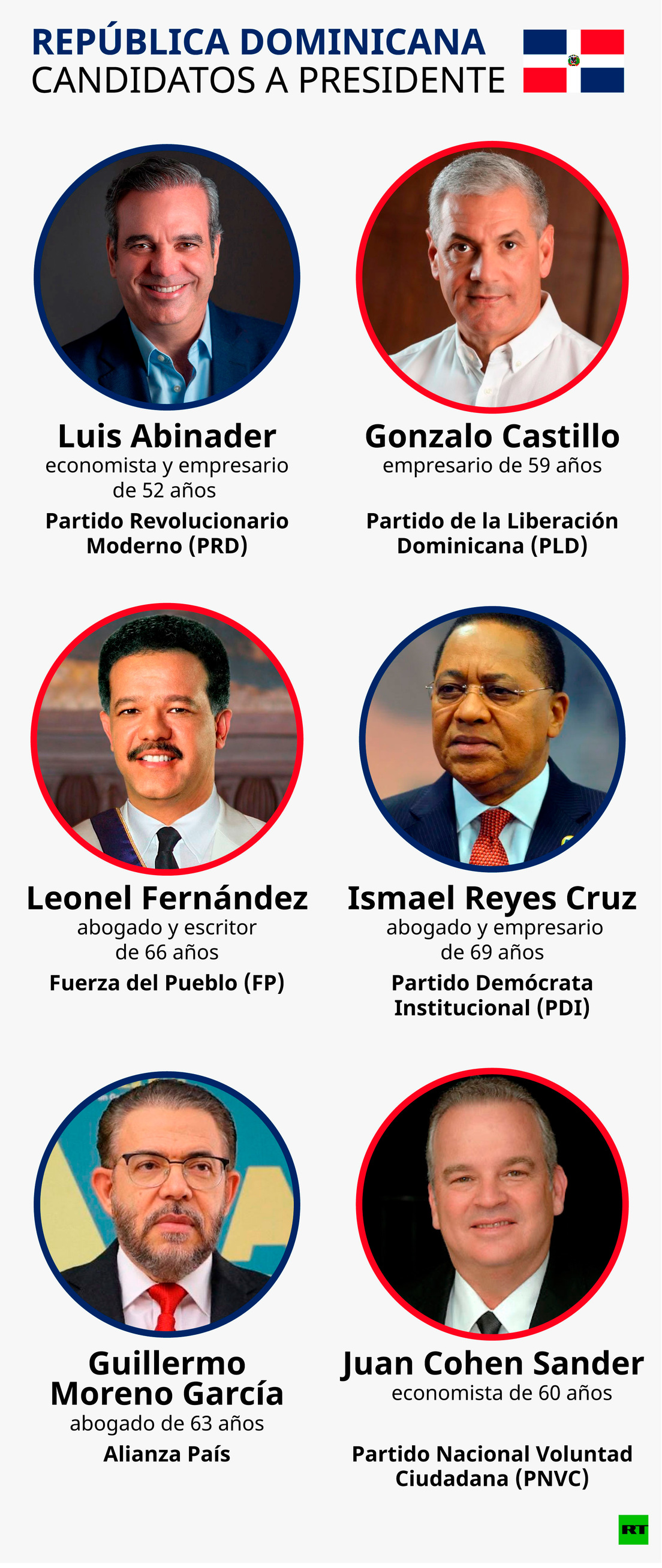 Por su parte, el candidato oficialista Gonzalo Castillo, empresario de 59 años, buscará mantener la administración del país en manos del Partido de la Liberación Dominicana (PLD), que gobierna ininterrumpidamente desde 2004.