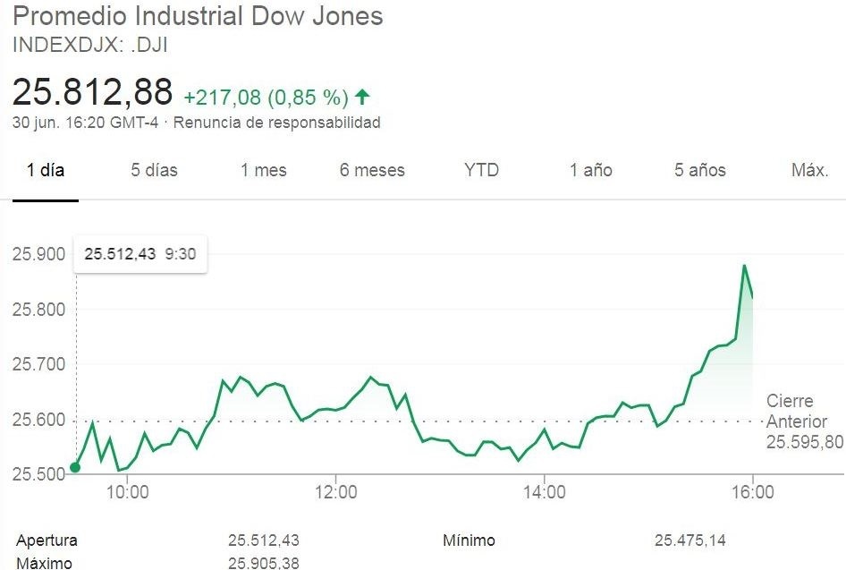 El promedio del Dow Jones ha subido este martes 217,08 puntos, un 0,9%, hasta los 25.812,88 puntos.