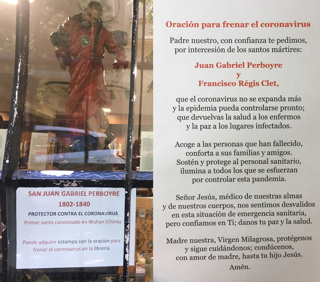 A pocos metros de la basílica, en la calle García de Paredes, se encuentra también la librería La Milagrosa, en la que se venden casi más figuras de vírgenes y santos que propiamente libros. En su escaparate, en un lugar preeminente, ofrecen imágenes del mártir, réplicas exactas de la que hay en el templo, con un cartel explicativo impreso en un folio: "San Juan Gabriel Perboyre (1802-1840). Protector contra el coronavirus. Primer santo canonizado en Wuhan (China). Puede adquirir estampa con la oración para frenar el coronavirus en la librería".