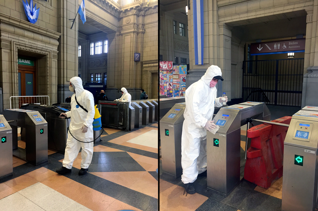 Las bancas públicas de las estaciones están cubiertas con sellos de plástico para evitar que los pasajeros se sienten. En el piso pintaron huellas que marcan el distanciamiento social requerido para evitar contagios. Las escaleras mecánicas están selladas. A cada rato, trabajadores cubiertos de trajes blancos especiales desinfectan los torniquetes.