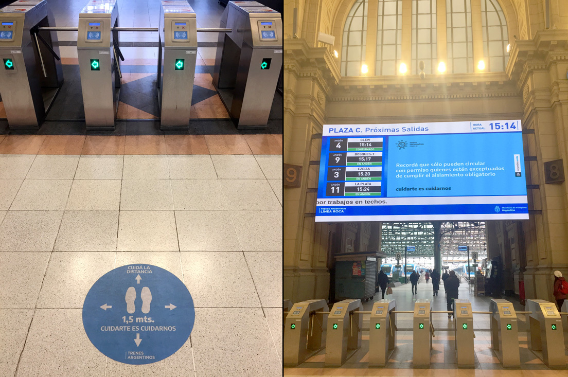 Los mensajes de alerta se propagan por doquier, ya sea en las pizarras de arribos y partidas de los trenes, en cartelerías fijas o en pantallas electrónicas distribuidas en las estaciones: "Quédate en casa", "Cuidarte es cuidarnos", "No nos descuidemos ahora", "Cuarentena responsable".