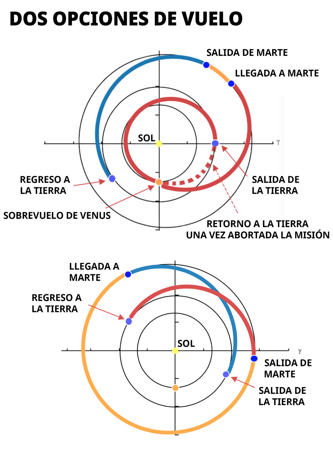 Despegar cuando la Tierra y Marte se alinean en sus órbitas, algo que ocurre solo cada 26 meses, y aguantar en el planeta rojo hasta que los planetas vuelvan a alinearse para el regreso es el escenario principal en el que trabajan las agencias espaciales. Implica que los astronautas estén prácticamente atrapados en Marte durante un año y medio, independientemente de la situación de cada uno.