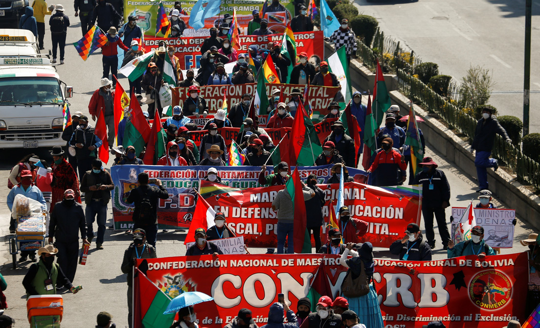 Entre los medios locales, el diario La Razón publicó imágenes de una columna de manifestantes avanzando por las calles capitalinas, con reclamos educativos. En concreto, aquellos maestros pidieron la renuncia del ministro de Educación, Víctor Hugo Cárdenas. La polémica se desató a raíz de la publicación del Decreto Supremo 4.260, que reglamenta la enseñanza virtual a distancia.