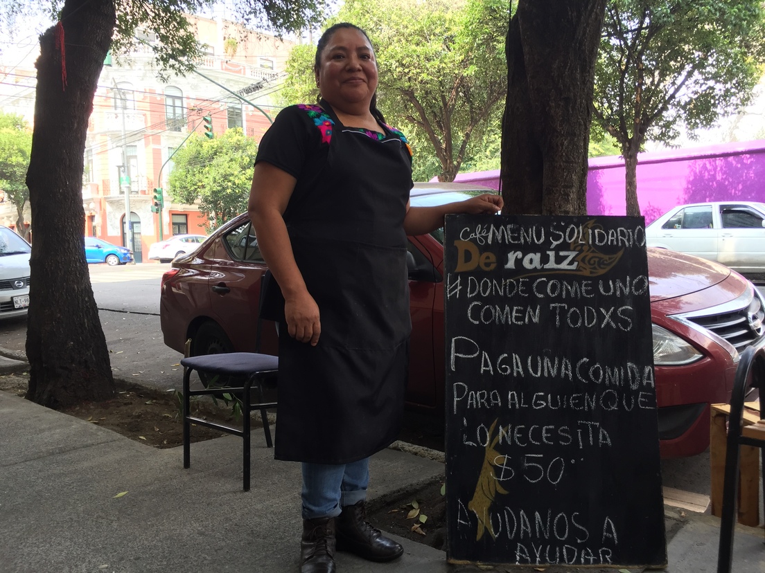 Carballo, la dueña del Café de Raíz de la colonia Roma, ideó los 'menús solidarios', que consisten en un tazón de sopa, arroz, frijoles, guiso y agua a una persona que lo necesite. La iniciativa se sostiene gracias a donaciones de 50 pesos (poco más de dos dólares) por quien quiera contribuir.