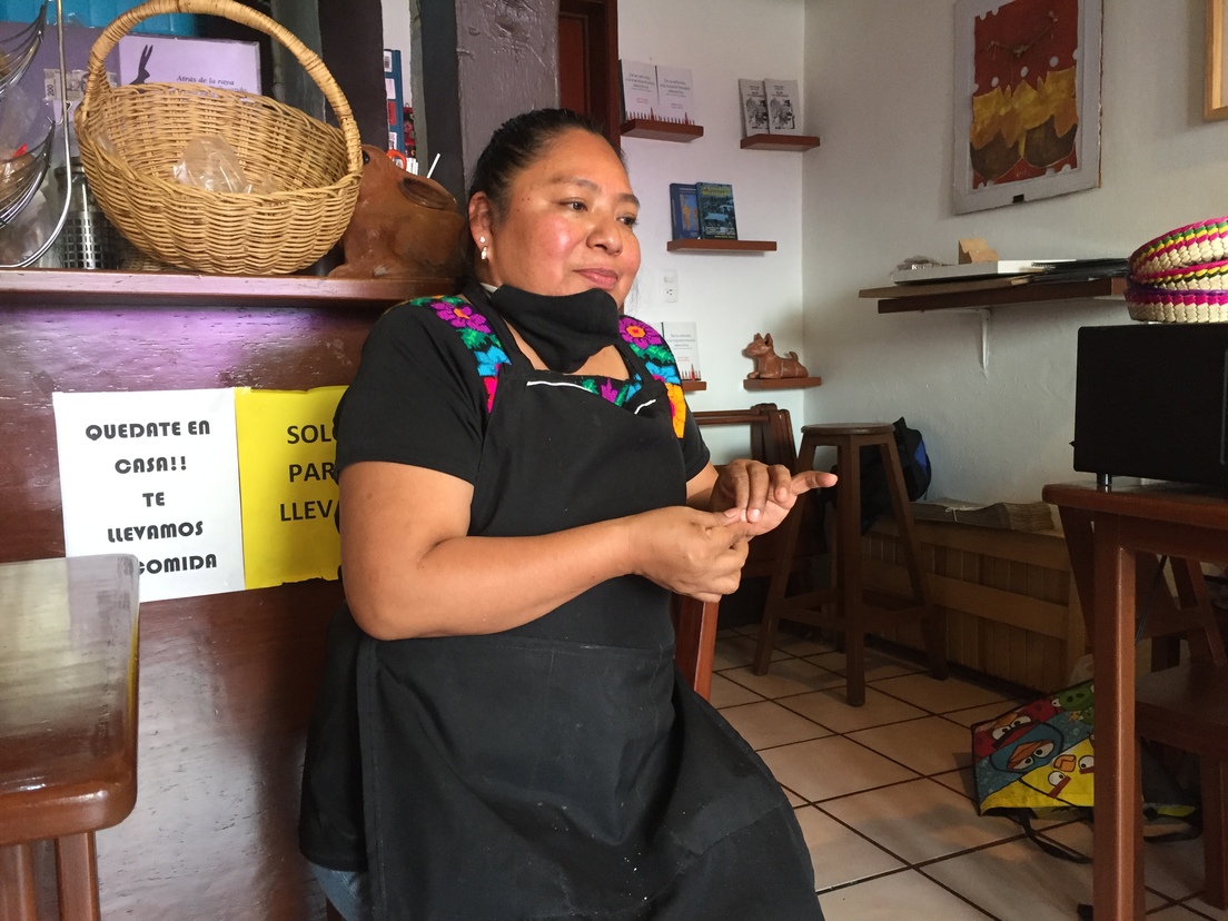 Pero el café o la comida típica de Veracruz que cocina no son suficientes para que esta mujer se sienta en casa. Para ella es fundamental hacer comunidad, tener "ese contacto, ese apapacho con el otro", dice la mujer, que viste una blusa negra con un bordado de flores coloridas.