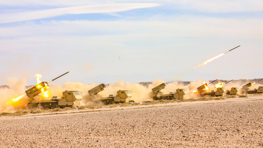 Lanzacohetes múltiples montados en vehículos lanzan un ataque contra objetivos simulados.