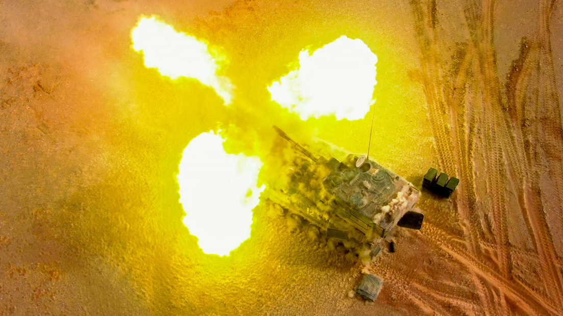 Un tanque que apoya a baterías de una brigada integrante del 76.º Ejército abre fuego contra objetivos simulados en un ejercicio realista.