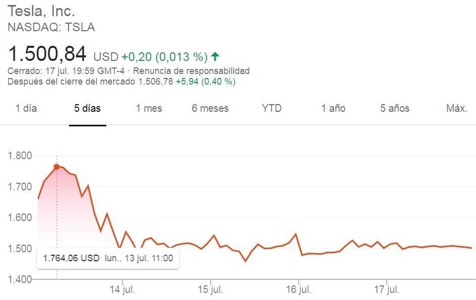 Tras el colapso de los mercados en marzo, las acciones de Tesla se han recuperado y están en alza. El 13 de julio, marcaron un máximo histórico de 1.794,99 dólares. A la hora de escribir este artículo, su precio se ha situado en 1.500,84 dólares.